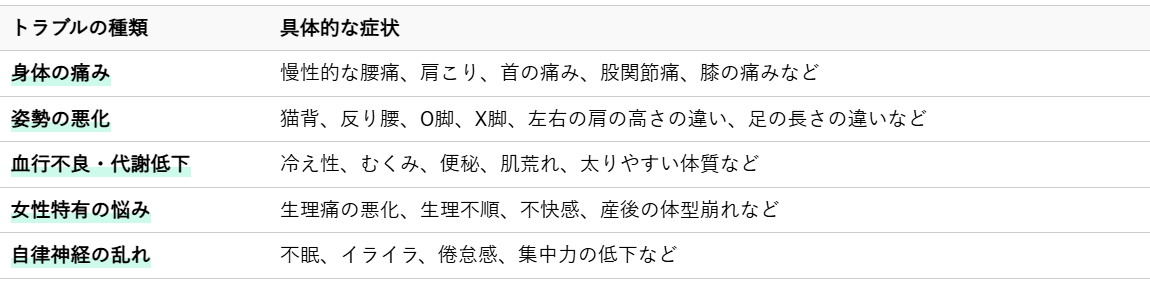 これらの症状に心当たりがある方は、骨盤の歪みが根本的な原因となっている可能性があります。放置せずに、早めのケアを検討することが大切です。