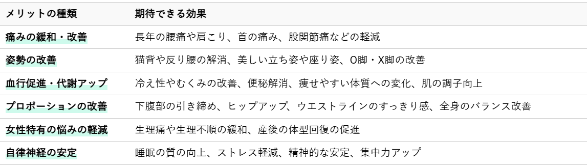 骨盤の歪みを整えることは、単に不調を改善するだけでなく、健康と美容の両面で多くのメリットをもたらします。骨盤が正しい位置に戻ることで、体の軸が安定し、本来持っている機能が最大限に発揮されるようになります。ここでは、骨盤矯正によって期待できる具体的なメリットをご紹介します。