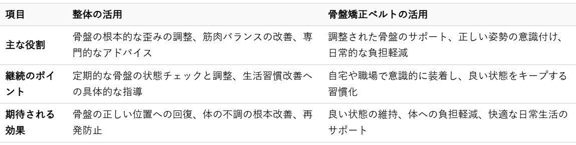 骨盤の歪みを根本から改善し、その良い状態を維持するためには、専門家によるアプローチとご自身での日常的なケアの連携が不可欠です。整体と骨盤矯正ベルトは、まさにこの二つの側面を補完し合う関係にあります。