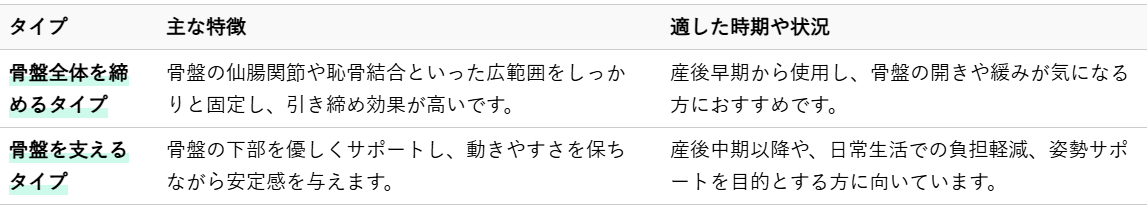 出産後の骨盤は、ホルモンの影響で緩んだ状態にあり、徐々に元の位置に戻ろうとします。この時期に適切なサポートを行うことで、骨盤の安定を促し、体型の回復を助けることができます。産後ケア用の骨盤矯正ベルトは、主に以下の2つのタイプに分けられます。