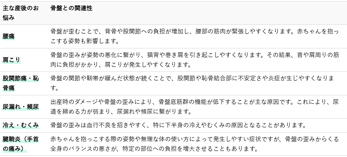 出産後、リラキシンの分泌は徐々に減少しますが、緩んだ靭帯や開いた骨盤がすぐに元の状態に戻るわけではありません。この時期に、骨盤が歪んだり、開いたままの状態が定着してしまうと、その後の身体の不調や体型変化の根本原因となることがあるのです。