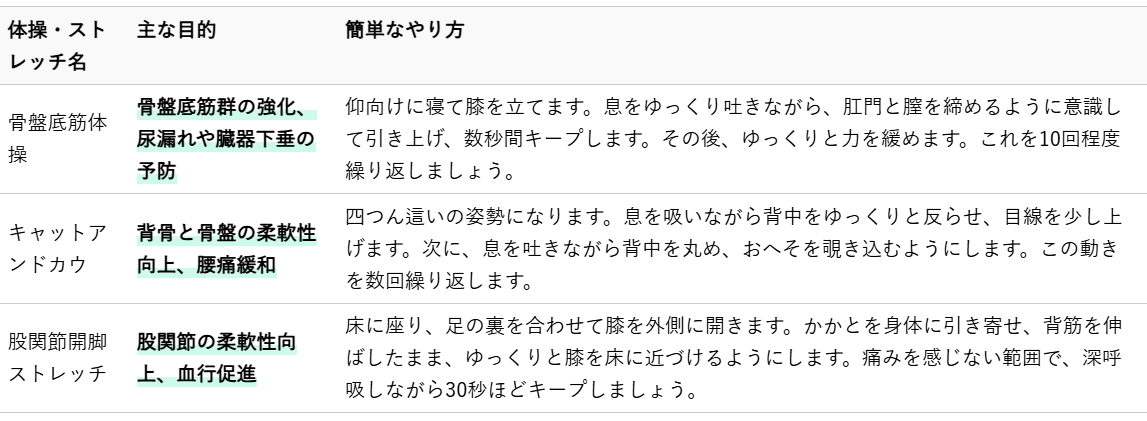 産後ママの身体はデリケートな状態ですので、痛みを感じない範囲で、毎日少しずつ継続することが大切です。ここでは、骨盤周りの筋肉をサポートし、柔軟性を高めるための体操とストレッチをご紹介します。