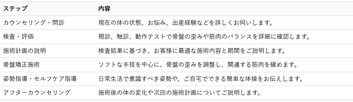 産後のデリケートな体に対し、骨盤矯正整体はどのように行われるのでしょうか。ここでは、整体院での一般的な施術内容と、安心して施術を受けていただくための流れを詳しくご説明します。
