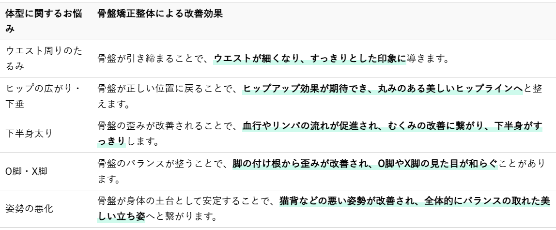 また、骨盤が正しい位置に戻ることで、下垂していた内臓が本来の位置に戻りやすくなり、内臓機能の活性化や基礎代謝の向上が期待できるため、痩せやすい身体作りにも繋がることがあります。