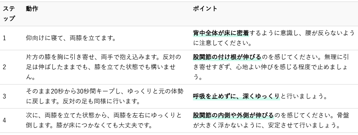 股関節の柔軟性は、骨盤の動きと密接に関わっています。股関節が硬いと、骨盤の動きが制限され、歪みの原因となることがあります。このストレッチは、股関節周りの筋肉を緩め、骨盤の正しい位置への誘導を助けます。