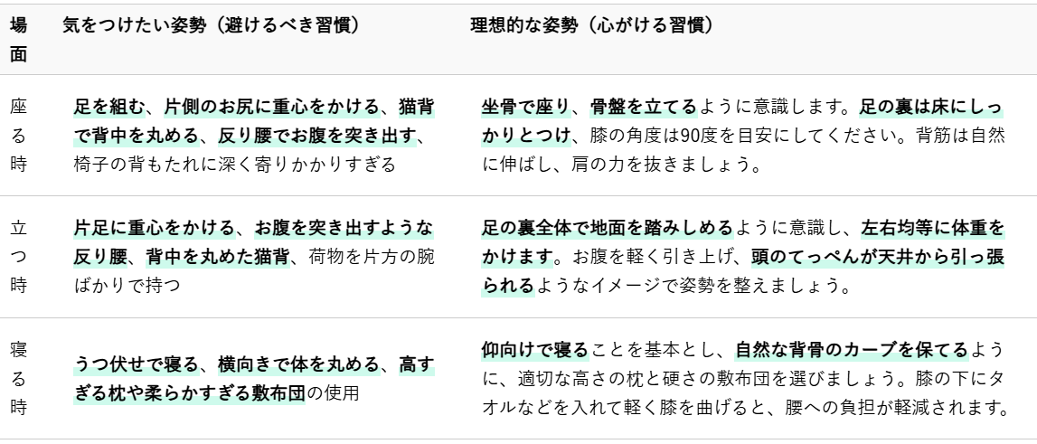 骨盤は体の土台であり、日々のあらゆる動作や姿勢が骨盤の状態に影響を与えます。特に無意識のうちに行っている習慣にこそ、歪みの原因が潜んでいることが多いものです。ここでは、特に気をつけたい姿勢のポイントを具体的な例とともにご紹介します。