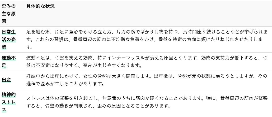 骨盤の歪みは、特定の原因によって引き起こされることがほとんどです。日々の生活習慣や体の使い方が、知らず知らずのうちに骨盤に負担をかけ、徐々に歪みを生じさせていることがあります。ここでは、骨盤が歪む主な原因と、それが体にどのような影響を与えるのかを整体師の視点から解説いたします。