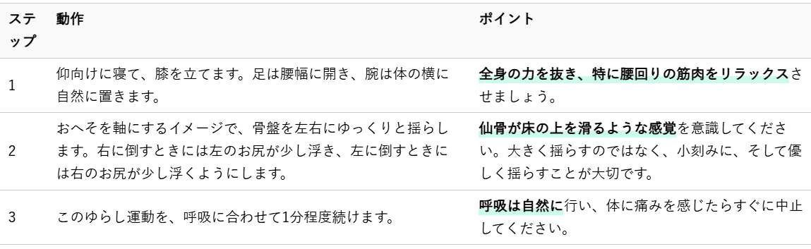仙骨は骨盤の中央に位置し、体の土台として非常に重要な役割を担っています。仙骨周りの動きが悪いと、骨盤全体の歪みに繋がることが少なくありません。この体操は、仙骨の動きを滑らかにし、骨盤のバランスを整えることを目的としています。