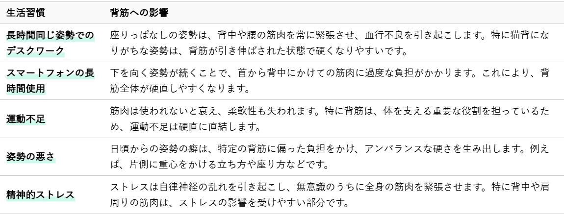 これらの習慣は、一つだけでなく複数組み合わさることで、より一層背筋の硬さを進行させ、腰痛のリスクを高めてしまうのです。