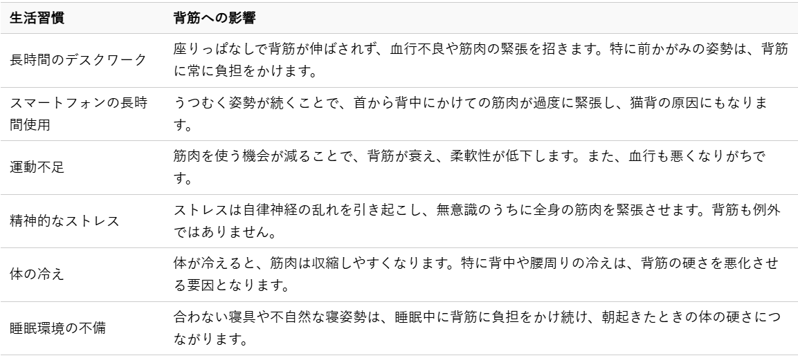 特に以下のような習慣は、背筋の柔軟性を奪い、硬さを助長する大きな原因となります。