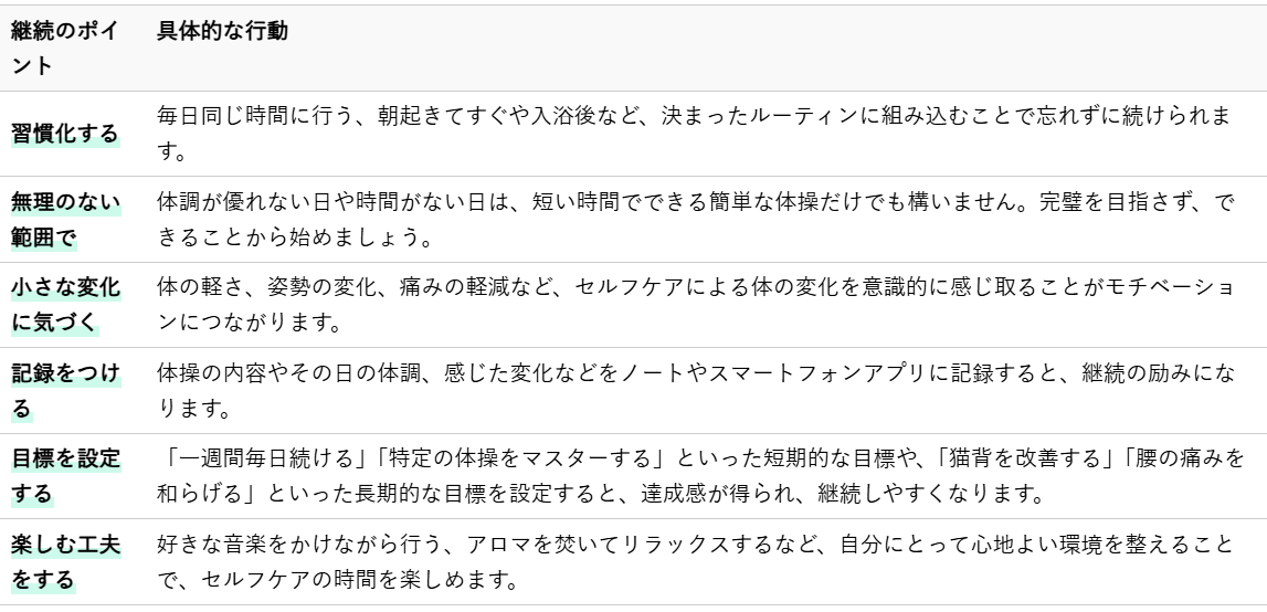 セルフケアは、自分のペースで無理なく続けられる点が最大のメリットです。継続することで、ご自身の体の変化に気づきやすくなり、より健康的な体へと導くことができます。