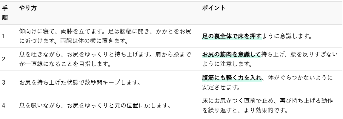ヒップリフトは、お尻の筋肉(臀筋群)と太ももの裏の筋肉(ハムストリングス)を同時に鍛えることができる体操です。これらの筋肉を強化することで、骨盤の安定性が向上し、歩行や立ち姿勢の改善に役立ちます。