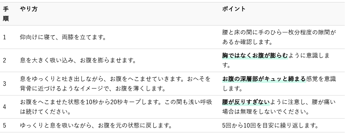ドローインは、お腹の深層にある腹横筋を鍛える効果的な体操です。腹横筋はコルセットのように骨盤を支える役割があり、体幹の安定に大きく貢献します。