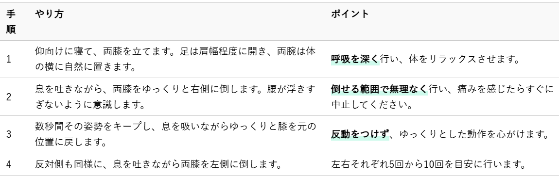 この体操は、股関節と腰椎の柔軟性を高め、骨盤の左右のバランスを整えるのに役立ちます。腰への負担も少なく、寝る前などリラックスしたい時に行うのがおすすめです。
