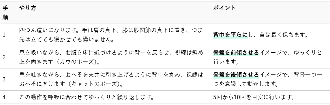 キャット&カウは、背骨と骨盤の連動性を高め、脊柱全体の柔軟性を向上させる体操です。骨盤周りの筋肉をほぐし、血行促進にもつながります。