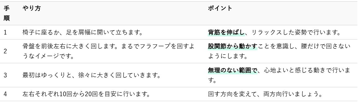 この体操は、特に腰周りの緊張を和らげ、骨盤の可動域を広げる効果が期待できます。