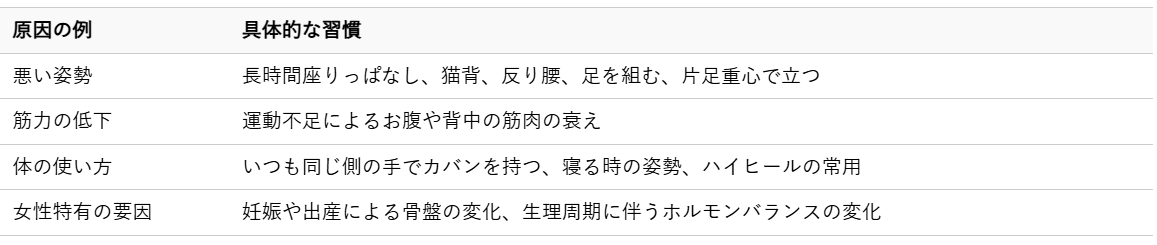 骨盤の歪みは、日々の生活習慣が大きく影響しています。無意識のうちに行っている癖が、少しずつ骨盤のバランスを崩しているかもしれません。ここでは、骨盤が歪む主な原因についてご紹介します。