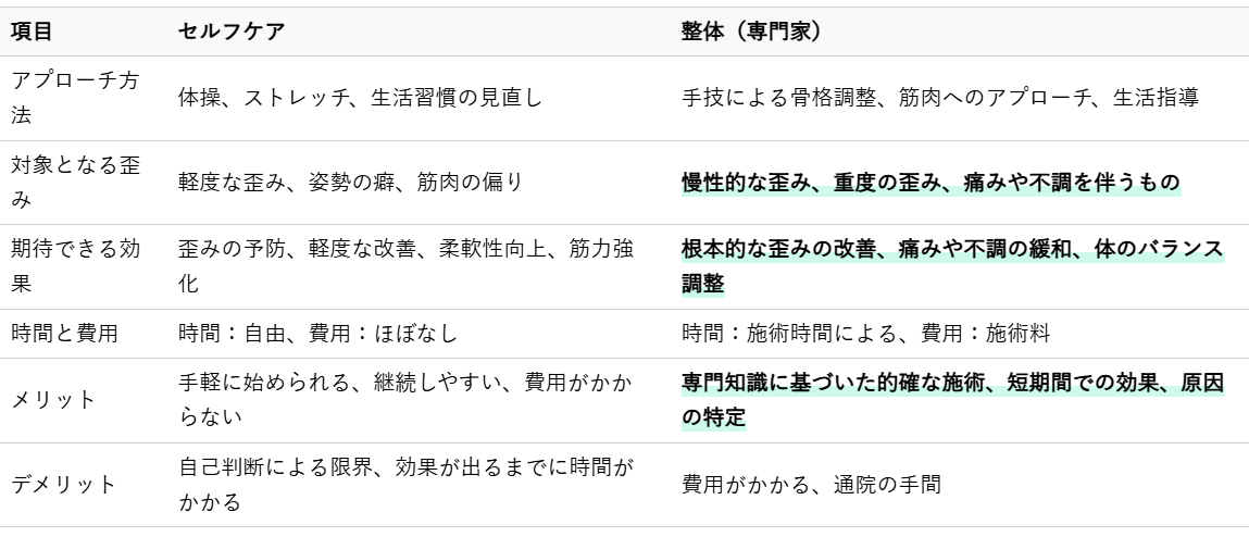 骨盤の歪みに対するアプローチは、ご自身で行うセルフケアと、専門家による整体の大きく2つに分けられます。それぞれのアプローチには異なる特徴があり、ご自身の状態や目的に合わせて選択することが大切です。