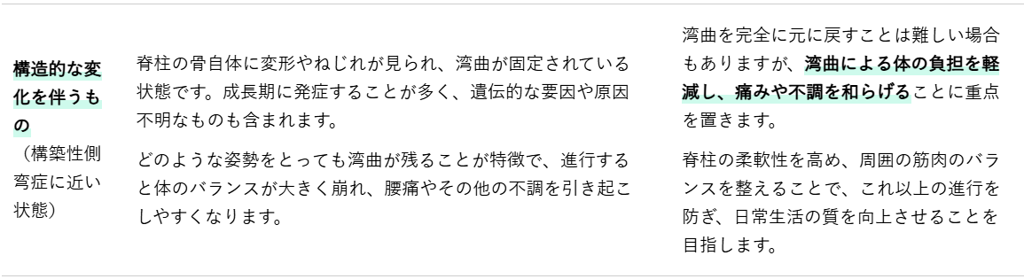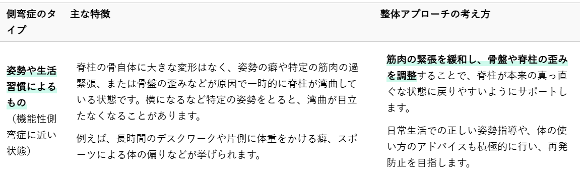 整体では、まず丁寧な検査を通じて、あなたの側弯症がどちらのタイプに近く、どのような特徴を持っているのかを把握します。その上で、それぞれのタイプに最適な施術計画を立て、効果的なアプローチを行います。