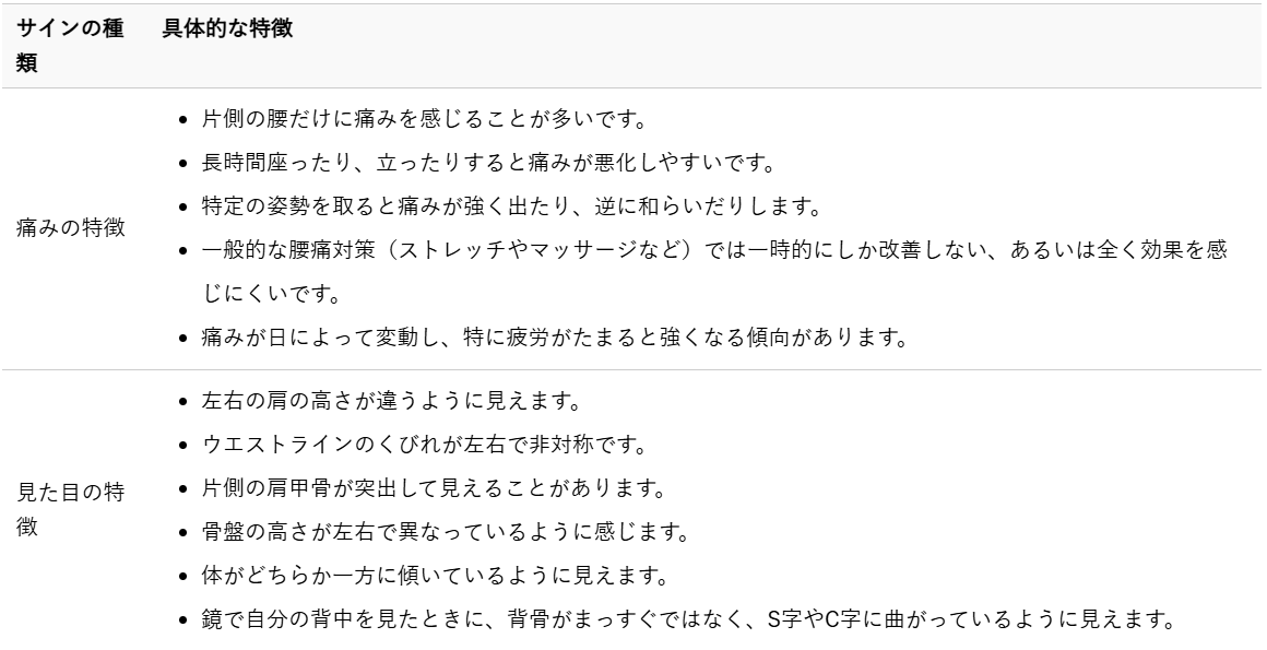 これらのサインは、あなたの腰痛が単なる筋肉疲労ではなく、脊柱の側弯による構造的な問題に起因している可能性を示唆しています。特に、体の歪みと腰痛が同時に現れている場合は、側弯症との関連性が高いと考えられます。