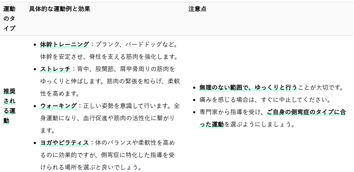 運動は、筋肉のバランスを整え、体幹を強化し、柔軟性を高めることで、側弯症による腰痛の改善に繋がります。しかし、全ての運動が側弯症に適しているわけではありません。ご自身の体の状態に合った運動を選び、無理のない範囲で行うことが重要です。