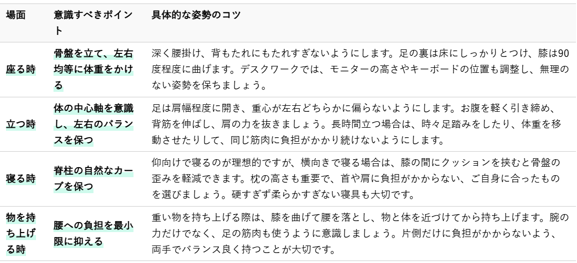 無意識のうちに行っている姿勢が、側弯症の腰痛を悪化させている可能性があります。特に、長時間同じ姿勢でいることが多い現代の生活では、正しい姿勢を意識することが非常に大切です。